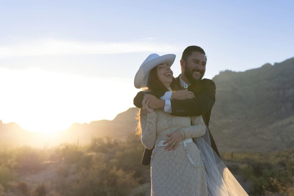 Couple eloping in Arizona kissing as he dips her in a cowgirl hat with the Superstition Mountains behind them and an artistic upside-down mountain reflection in the sky